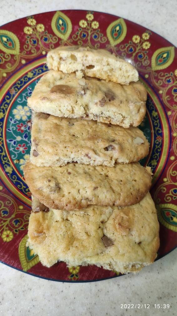 Есть замечательная семья кондитеров из Москвы. Кондитерская их называется алекс и милана. А зовут их Алексей и милана. Рецепт с их сайта alexmilana. Ингредиенты: Масло сливочное, сахарной пудры, тростникового сахара, соли, Муки, разрыхлителя, орехи грецкие, тёмного шоколада Способ приготовления: Масло комнатной температуры взбить с сахарной пудрой и тростниковым сахаром. Ввести яйца. Смешать все сухие ингредиенты и замешать тесто лопаткой. На пленку выложить тесло и сформировать колбаску. Убрать в холодильник на 1.5-2 часа. Разогреть духовку до 170 градусов и нарезать печёнки толщиной 2-3 см. Уложить на пергамент. Выпекать 15- 18 минут. До золотистого цвета.