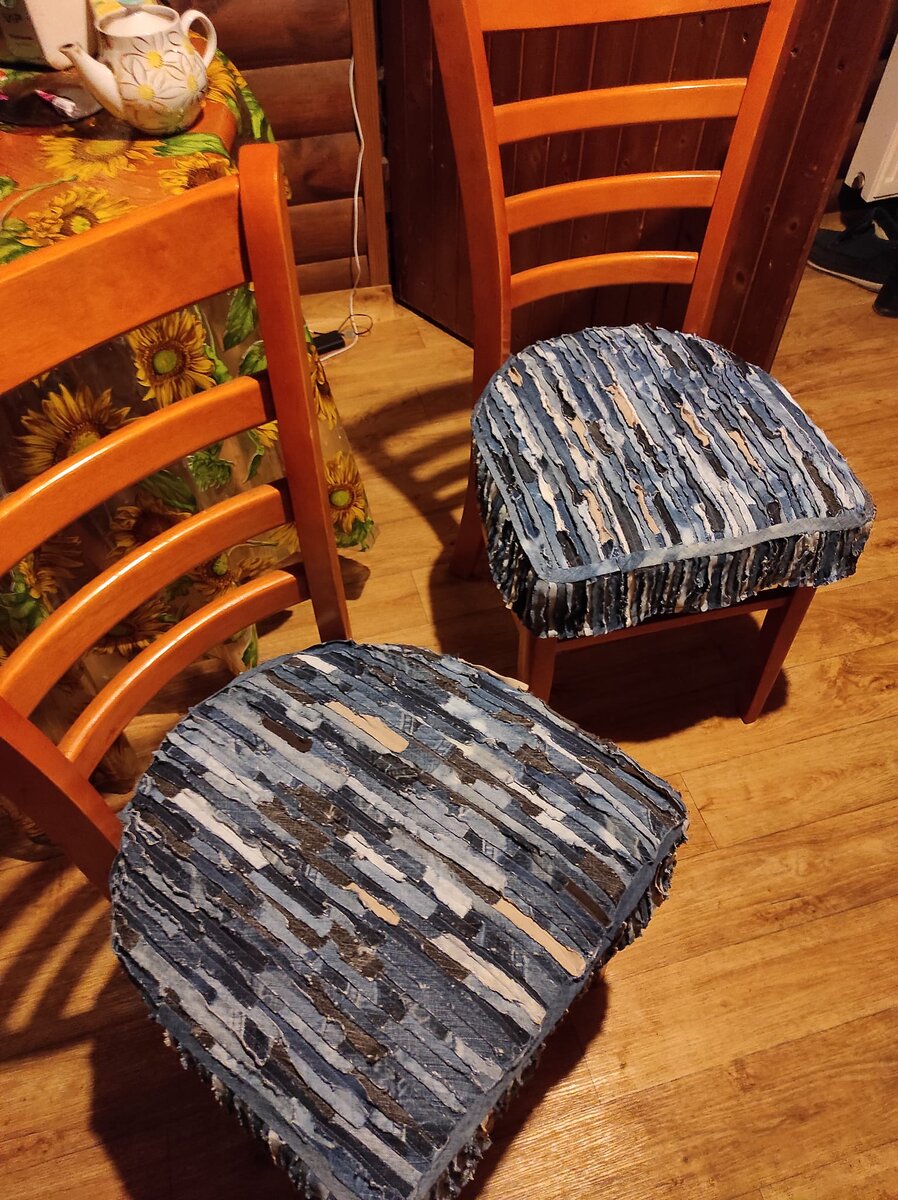 Если дома скопилась много немодных джинсов, у вас есть швейная машинка и несколько уроков труда из школьной программы вы зашли к нам по адресу. Мы покажем как обновить старую мебель старыми джинсами. Уважаемые читатели моего блога - я знаю что у меня есть ошибки в тексте - я пишу так как пишу. Спасибо за понимание. Накидки на стулья. Техника джинсель, слегка изменённая: полоски нарезала длиннее и по косой, они не так сильно лохматятся, слегка потрепала, эффект интересный. Крепятся завязками за задние ножки. листаем галерею ➡️➡️➡️ Ремонтируем очень старое кресло. Основа утепленные джинсы (с начесом) они более устойчивы к натяжению и истиранию. Для украшения использовли все что было под рукой: старый свитер был использован как дорога, из остатков неопрена и других тканей - домики и машинки. Облака и деревья из остатков от войлочных проектов. Поролон частично заменен. Автор Елена Догадина. листаем галерею ➡️➡️➡️ Еще один пример чехлов на стулья. Для наших рукодельниц