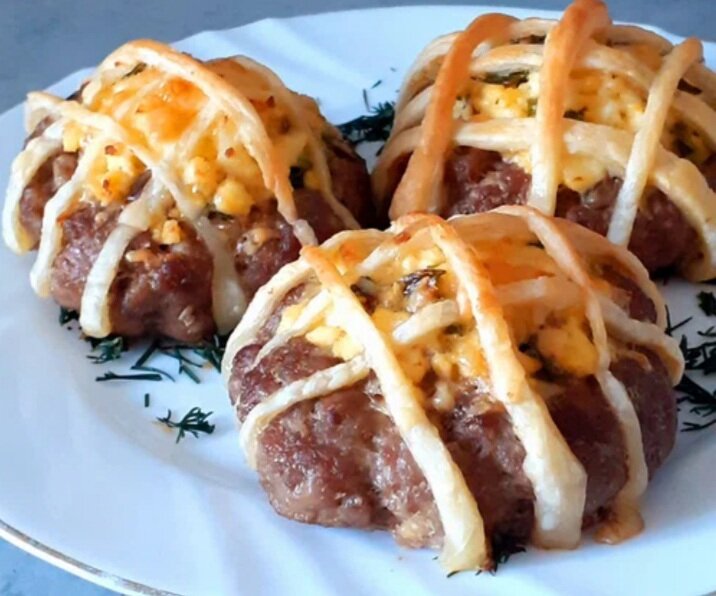 Если банальные котлеты уже приелись, то тогда предлогаю приготовить оригинальные котлетки по этому рецепту. Очень вкусные, сытные котлетки фаршированные сыром и яйцом отлично подходят на повседневный или праздничный стол! Такие аппетитные котлетки в духовке точно не оставят равнодушными Вашу семью! Приготовление: Из фарша сформировать круглые котлетки и выложить на противень. Стаканом сделать углубление, вылоложить начинку. По желанию сверху укрываем тонкими полосками слоёного теста, как сеткой, отрезав свисающие концы. Сверху смазать желтком. Выпекать при 180° 35 - 45 минут. Подавайте котлетки с овощами, с макаронами или с картофельным пюре. Приятного аппетита!) Ингредиенты: • Фарш мясной 800 гр. • Тесто слоёное 100 гр. Начинка: • Яйцо 2 -3 шт. • Зелёный лук 1 пучок • Сыр 50 - 70 гр. Подписывайтесь, чтобы не потерять и не пропустить новый рецепт! Вкусное и сытное блюдо! Рагу с куриными сердечками! Самый вкусный перекус! Мягкие булочки со вкусом пиццы! Нежный пирог с любыми ф