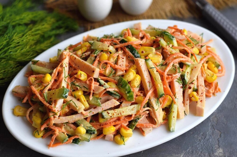 Салат "Оперативчик" имеет такое названия, поскольку готовится быстро и оперативно. Все ингредиенты используются в начальном виде, не требуют термообработки. Нарезаются они полосками, смешиваются и пропитываются майонезом. Морковь по-корейски своим кисло-сладким вкусом и легкой остротой отлично дополняет ветчину. Салат получается легким, низкокалорийным и очень вкусным, имеет аппетитный внешний вид. Ингредиенты: Приготовление: Подготовьте все необходимые продукты для приготовления салата. Ветчину нарежьте тонкой соломкой, сгрузите ее в глубокую емкость. Вместо ветчины можно использовать балык. Свежий огурец ополосните, высушите, также нарежьте соломкой, закиньте к ветчине. Морковь по-корейски разрежьте на более короткие полоски. Морковь можно приобрести в магазине или заранее приготовить самостоятельно. Консервированную кукурузу процедите от маринада. Морковь и кукурузу добавьте в основной состав. Свежий укроп ополосните, мелко нашинкуйте, поместите в салат. Заправьте майонезом, присыпь