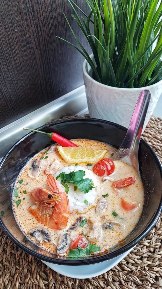 Если в Таиланде вы решите обедать в разных местах, то никогда не встретите одинаковый по вкусу Том Ям.🥘 Этот экзотический острый суп настолько многогранен, что ни у одного тайца не получится готовить его в строгих рамках единого рецепта. Я не претендую на произведение искусства, ведь чтобы суметь приготовить настоящий Том Ям, нужно родиться в этой солнечной стране🌴🌞 Но для меня-это идеальный рецепт этого горячего и согревающего супчика🌶 Ингредиенты: Куриный бульон, Кокосовое молоко, гр Паста Том Ям, гр Рыбный соус, гр Помидоры черри, гр Грибы шампиньоны, вешенки, гр Перец чили, гр Морепродукты, гр Чеснок, гр Корень имбиря, гр Зелень кинзы, гр Лимон или лайм, по вкусу Соль Способ приготовления: Первым делом отварить куриный бульон. Почистить корень имбиря и порезать его тонкой соломкой. Чеснок просто измельчить. Грибы помыть и произвольно порвать руками или порезать ножом. Мелко порезать перец чили. Помидоры черри помыть и разрезать пополам. Зелень кинзы мелко порубить. Куриный буль