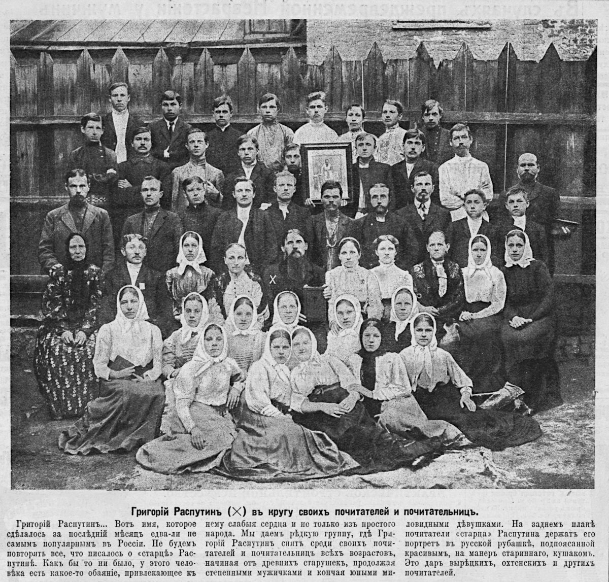 “Григорий Распутин... Вот имя, которое сделалось за последний месяц едва-ли не самым популярным в России. Не будем повторять все, что писалось о «старце» Распутине. Как бы то ни было, у этого человека есть какое-то обаяние, привлекающее к нему слабые сердца и не только из простого народа. Мы даем редкую группу, где Григорий Распутин снят среди своих почитателей и почитательниц всех возрастов начиная от древних старушек, продолжая степенными мужичками и кончая юными миловидным девушками. На заднем плане почитатели «старца» Распутина держат его портрет в русской рубашке, подпоясанной красивым, на манер старинного, кушаком Это дар вырецких, охтинских и других почитателей.” #старые журналы #старые фотографии #начало 20 века
