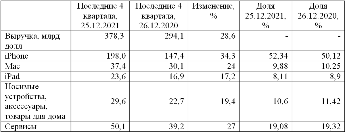 Apple (AAPL) опубликовала отчёт за 1 квартал фискального 2022 г. (1Q FY22), закончившийся 25 декабря. Выручка выросла на 11,2% до $124 млрд. Чистая прибыль в расчёте на 1 акцию с учётом возможного размытия (diluted EPS) составила $2,1 против $1,68 в 1Q FY21. Результаты превзошли ожидания рынка. Аналитики, опрошенные Refinitiv, в среднем ожидали, что выручка будет $118,7 млрд и diluted EPS $1,89. Валовая рентабельность (Gross margin) 43,8% против 38,2% годом ранее. Денежный поток от операционной деятельности подскочил на 21,2% до $47 млрд. Денежные средства и эквиваленты, а также к/с фин.вложения составили $64 млрд на конец квартала. Чистый долг сократился с $62 млрд до $59 млрд. “Чистый долг / EBITDA” < 1. Выручка от продаж айфонов выросла на 9,2% до $71,6 млрд. Аналитики прогнозировали $68,34 млрд. Компания связывает результаты с большим спросом на линейку новых продуктов и отмечает улучшение ситуации с дефицитом комплектующих. Доходы от сервисов подскочили на 23,8% и составили $19,5