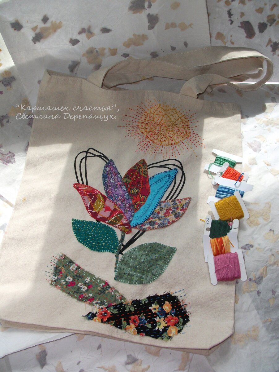 Кармашек счастья не только название моей мастерской. Сегодня это будет сумка, созданная с любовью, старательно и вдохновенно. Всё мои сумки и "сумчатые" мастер-классы легко найти по тегу кармашексчастья_сумка Для сегодняшней работы нам понадобится любая тканевая сумка, несколько разноцветных лоскутков, игла для ручного шитья, нитки мулине, швейные нитки и свободный вечерок. При желании можно нарисовать эскиз, а я обошлась волшебной техникой "на глазок", которая так удобна для стиля «бохо», в который эта сумка вписывается идеально. На моей сумке уже был принт - сердечко. Я решила вписать в этот рисунок фантазийный лоскутный цветок. Начала со стебля и листочков. На глаз вырезала 2 зелёных листика. Края подогнула вовнутрь и прошила (после притачивания деталей к сумке эту ниточку нужно удалить). Так же впоследствии обрабатываются все листочки и лепестки цветка. Для стебелька я взяла полосочку ткани, скрутила её в стебелёк, пришила швом через край нитками мулине. По обеим сторонам