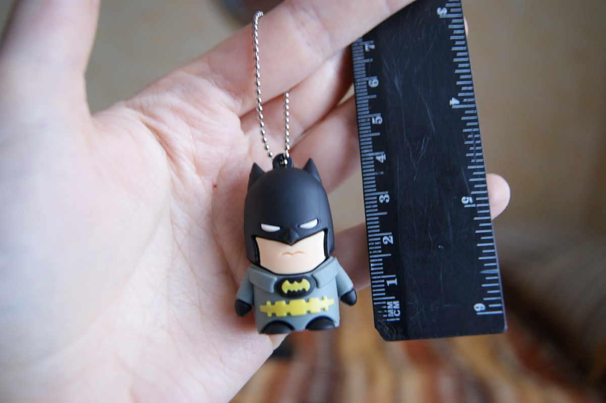 Среди флешек с интересным дизайном, флешка на 16 ГБ в виде фигурки Бэтмана оказалась особенно удачной находкой. На момент покупки её цена составляла около 900 рублей, а версия на 128 ГБ доступна за 1500 рублей. Однако в данном случае я выбрал 16 ГБ, так как она была задумана в качестве подарка. Так уж получилось, что в кругу нашего общения есть Бэтман. Правда, он болел в детстве, поэтому ростом очень мал, хрупок, и вообще девушка :) Прозвища не выбирают, а вот подарки для друзей выбрать – дело святое! С Бэтманом мы живем не в одном городе и видимся редко, поэтому подарки приходится отправлять почтой. Посему идеальным презентом является что-то тематическое, небольшое, прочное и полезное. Идеальное решение в данном случае – стилизованная фигурка Бэтмана, который по совместительству является флешкой на 16GB. Фигурка выполнена из мягкого и приятного на ощупь резинового материала, что добавляет ей долговечности. Размер составляет 4х2 см, поэтому она удобно помещается в руку и достаточно про