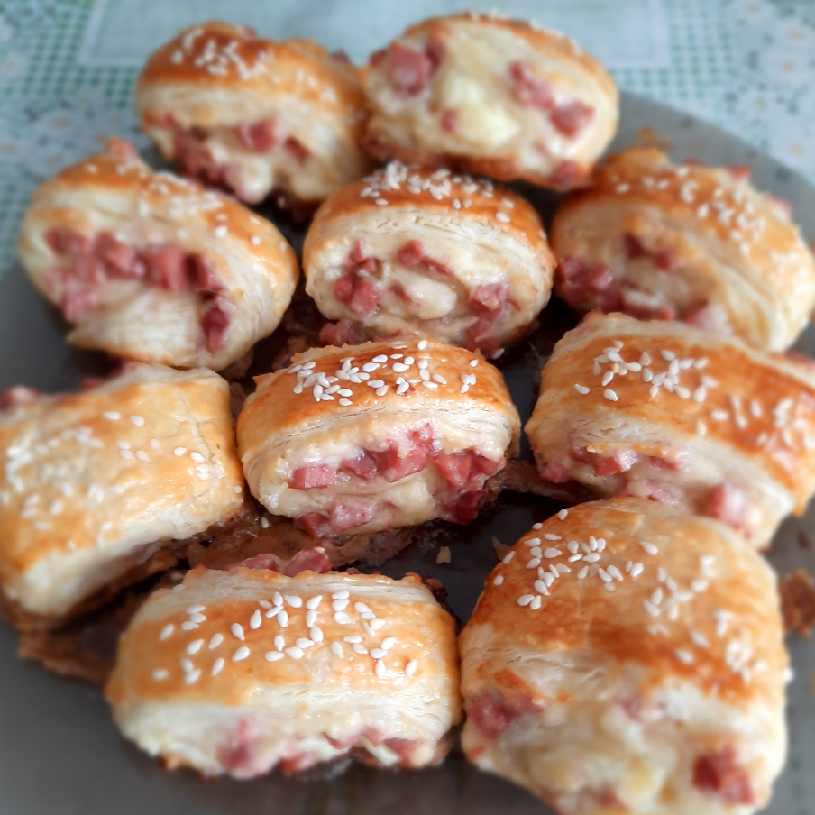 Рулетики из слоеного теста с сыром и колбаской