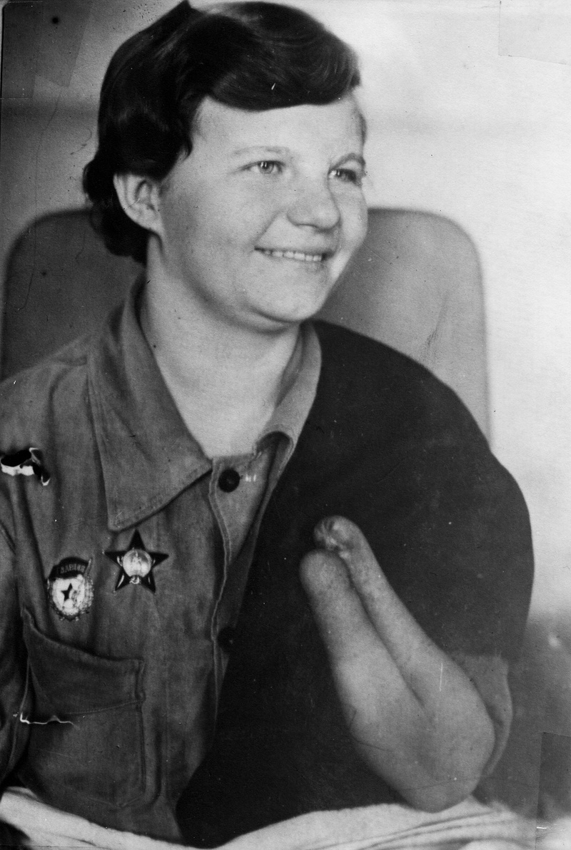 Зина Туснолобова писала это протезом, на который была надета специальная манжетка с ручкой. Рук и ног она лишилась на фронте. Ей было всего 23, и ее ждали десятилетия счастливой жизни. Но тогда думала, что для нее все кончено. Зина родилась вблизи Полоцка, в нынешней Белоруссии. Когда ей было десять, отца арестовали, и семья переехала в Кемеровскую область. Ничего особенного — все как у многих в те годы. И Зина росла так же, как большинство советских ребят: занималась спортом, пела в хоре, а в 18 лет, после смерти отца, пошла работать. При вступлении в комсомол ее спросили, что она будет делать, если придется защищать Родину. "За Родину — жизнь отдам", — ответила она. Шел 1939 год. До возможности доказать это оставалось совсем не долго. После начала войны Зина окончила курсы медсестер и ушла на фронт. За первые же пять дней боев вынесла из-под огня 26 раненых и вскоре получила орден Красной Звезды. Еще несколько месяцев спустя счет спасенных ею людей перевалил за сотню. Но однажды,