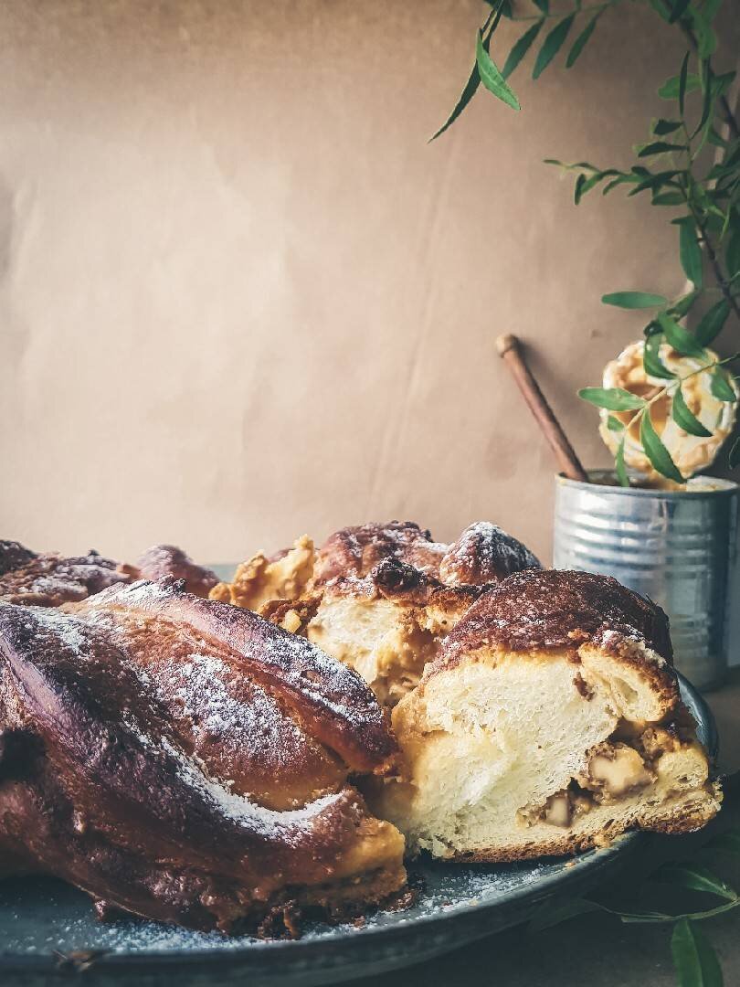 Бесподобное сочетание вареной сгущёнки и солёных орехов.Тесто получается воздушное. p.s.Я добавила тростниковый сахар, вместо обычного Ингредиенты: муки, дрожжи сухие , сахар, яйца С1, соли, молоко, мягкого сливочного масла, начинка, вареной сгущёнки, мягкого сливочного масла, орехи на ваш выбор (арахис, фундук, пекан) Способ приготовления: Просеять муку, добавить все ингредиенты кроме сливочного масла. Вымешивать 7 минут, тесто сначала будет прилипать сильно к рукам, но потом разовьётся клейковина и перестанет липнуть. Далее добавляем сливочное масло. Замешиваем 5 минут. Тесто так же будет липнуть, но не добавляйте больше муки, по истечении времени оно перестанет прилипать и будет мягкое, но не липкое. Перекладываем в чашу, накрываем плёнкой и оставляем в тёплом месте на 90 минут. По истечении времени, поверхность присыпаем чуть мукой, раскатываем тесто в пласт 40×20. смазываем сгущёнкой и посыпаем орехами. Скручиваем трубочкой, разрезаем пополам и сворачиваем косичкой. Из фольги сдел