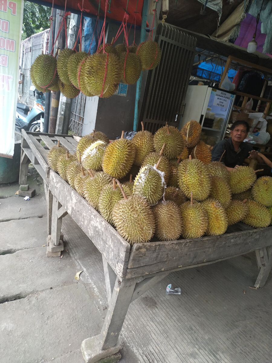 Вот как их можно перепутать, КАК?! А некоторые всё же умудряются. Но эти два фрукта хоть и являются родственными, но друг на друга ни внешне, ни внутри, ни на запах, ни на вкус не похожи совершенно! Разве что расположением косточек внутри мякоти. Вот это - дуриан: Мой любимый фрукт. У него притягательный чарующий сладкий аромат и божественный вкус. Распространяется аромат на несколько метров из-за сильного испарения це два аш пять о аш, содержащегося в зрелом фрукте. Сортов дуриана много - бангкокский, балийский, да и одних яванских штуки три. Соответственно, и цена на него различается в зависимости от сорта. Самый дешёвый - 20000 рупий за килограмм (около 100 рублей). Стоимость одного плода в Индонезии может достигать 500000 рупий - 2500 рублей. Зависит от сорта, веса и места продажи. Шкура дуриана покрыта длинными шипами, потому он и дуриан - duri - шип, an - окончание, которое превращает существительное в прилагательное. Дословно можно перевести слово "дуриан" как "ошипованный". Вот