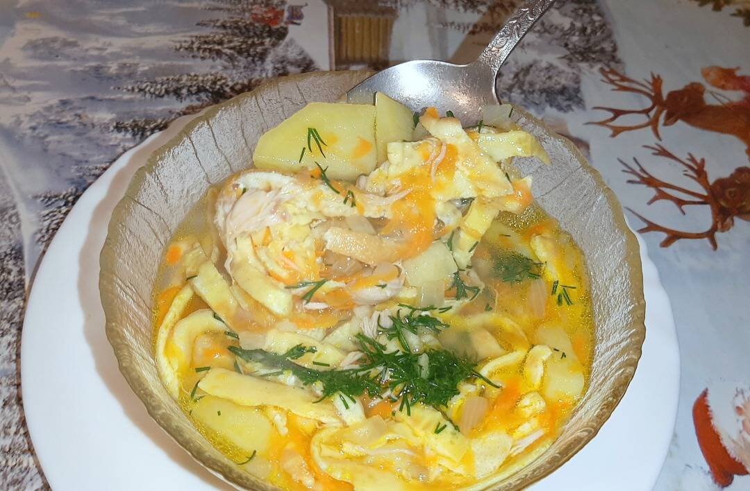 По-домашнему вкусный, ароматный, золотистый куриный супчик! Особенностью его являются яичные блинчики, которые придают супу дополнительный вкус, нежность и делают его более сытным и по - особенному аппетитным! #суп #куриныйсуп #первоеблюдо #суплапша Ингредиенты: Куриных бедрышек, Яйца, Морковь, Репчатый лук, Картошка, Соль, специи, лавровый лист , Зелень, чеснок для подачи, Растительное масло для жарки Способ приготовления: Куриные бедрышки сварить до готовности. Отделить мясо от кости и переложить его обратно в бульон. Добавить в суп картофель нарезанный тонкими брусочками. Посолить, поперчить по вкусу. Варить минут 10. Тем временем морковь натереть на крупной терке, а лук нарезать маленькими кубиками, обжарить овощи на сковороде с небольшим количеством растительного масла. Добавить зажарку в суп, лавровый лист и поварить еще минут 5-10. Перед подачей посыпать измельчённой зеленью и чесноком. Приятного аппетита! Ссылка на видео: Пока варим суп сделаем яичные блинчики. Яйца по одному в