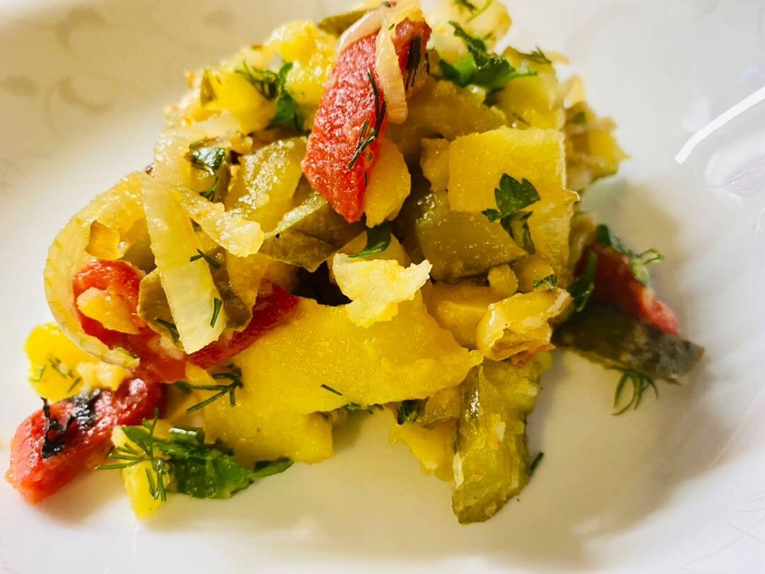 Абсолютно постный, но сытный и вкусный салат. Вполне можно подать его как гарнир к рыбному или мясному блюду. Хорош как тёплым, так и остывшим. #игры #овощнойсалат #веган Ингредиенты: картофель, лук репчатый, перец сладкий, маринованный, половинки вяленых помидоров в масле, соленый огурец, веточки петрушки, веточки укропа, соль, чёрный молотый перец, растительное масло Способ приготовления: Картофель отварить, нарезать толстой короткой соломкой. Сложить в большую емкость для салата. Репчатый лук нарезать полукольцами и обжарить на сковороде, в небольшом количестве растительного масла, до золотистого цвета. Немного посолить в процессе. Маринованный перец (консервированный), соленый огурец и вяленые помидоры, нарезать, как и картофель, толстой соломкой. Зелень мелко порубить. Сложить все овощи в салатник к картофелю. Приправить чёрным перцем и посолить по вкусу. Немного полить маслом от вяленых помидоров. Аккуратно перемешать, подавать тёплым. Но и остывший, салат очень вкусный. А ещё, е