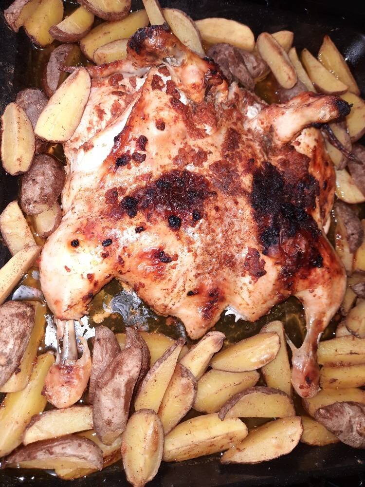 #игры Наверное самое распространённое и простое блюдо и вкусное очень Ингредиенты: Курица, Картошка, Соль , Любимые приправы, Масло для смазывания противня Способ приготовления: Курицу моем, разрезаем по грудке, натираем солью и специями. Картошку хорошо моем, у меня домашняя картошка, поэтому я не чищу её, режем на четвертинки, солим и добавляем специй у меня красный перец и паприка. Запекаем в духовке 50 мин при 200 С. Приятного аппетита.