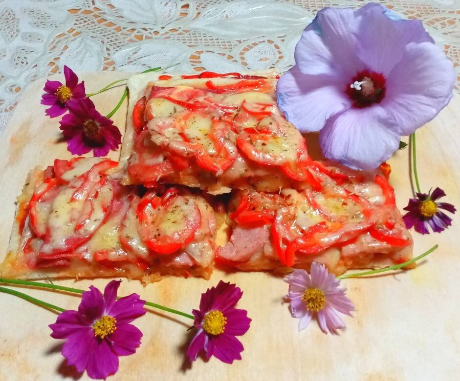 Пицца на слоёном тесте получается тонкая и очень вкусная. Начинку можно положить любую, что найдёте в холодильнике, главное - сыра побольше. Алычу в пиццу я положила ради интереса, получилось очень вкусно - с нежной и приятной кислинкой. #пицца #игры Ингредиенты: готового слоёного теста , колбасы п/к, шпикачка, луковица, болгарский перец, помидора, алычи, кетчупа, сыра Моцарелла, сыра Гауда, итальянские травы Способ приготовления: Достать тесто за 1 час до готовки, полностью разморозить его при комнатной температуре. Нарезать все ингредиенты для пиццы, 2 вида сыра натереть на крупной тёрке. Тесто немного раскатать на антипригарном коврике, переложить на противень и дальше растянуть тесто руками. Смазать кетчупом, отступив 1 см от края, посыпать Моцареллой, сверху выложить колбасу и шпикачку, лук полукольцами. Следующий слой - помидоры, а затем болгарский перец и алычу. Обильно посыпать сыром Гауда. Выпекать пиццу в духовке, разогретой до 230° на самом нижнем уровне 10 - 15 минут, как т