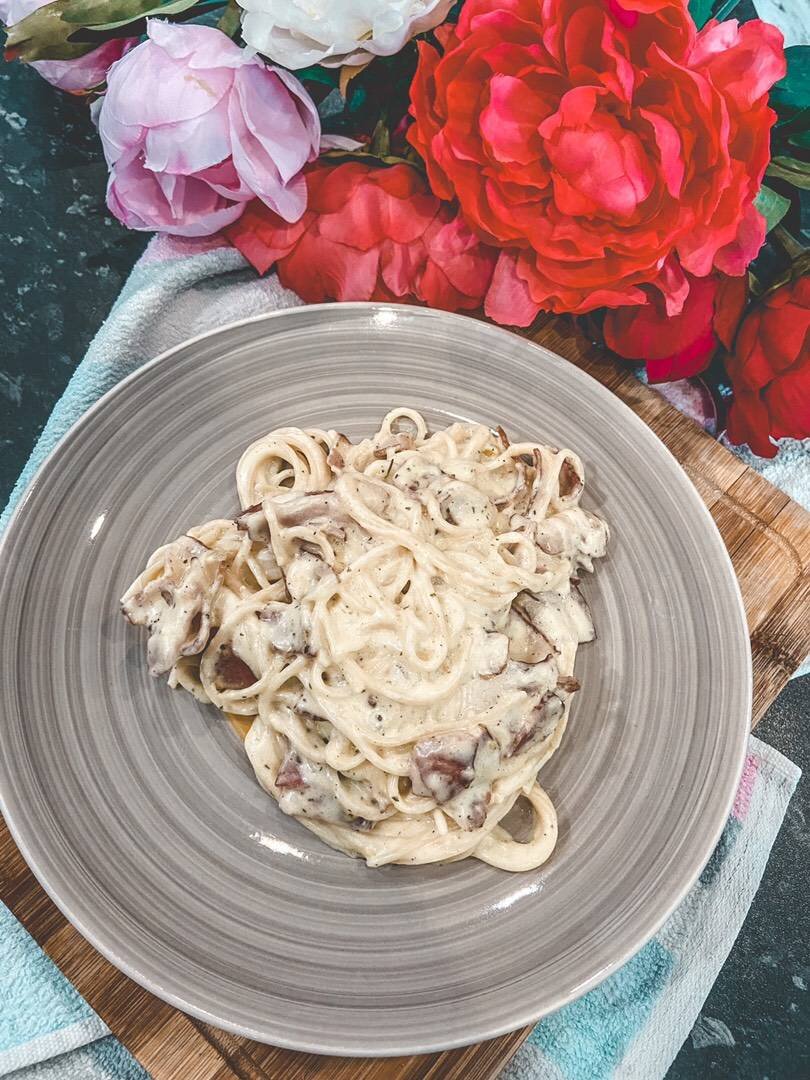 Ингредиенты: спагетти 🍝, бекон 🥓 сырокопчёный, сыра 🧀, сливки 🥛, соль/перец Способ приготовления: Отварить макароны до готовности. Бекон обжарить на сухой сковородке 2-3 минуты. Когда бекон немного обжарится, добавить сливки, довести до кипения и убавить огонь. Добавить сыр, постоянно помешивать до растворения сыра. Макароны добавить к сливкам и бекону, перемешать и прогреть 1–2 минуты. Посыпать черным перцем: все готово!
