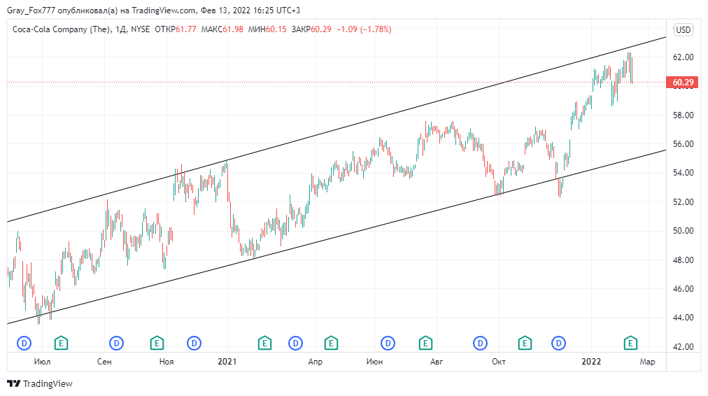 Вот примерно вот так они выглядят в акциях компании Coca-Cola. Мы давно следим и наблюдаем за трендовым каналом, который и формируют две восходящие линии тренда.