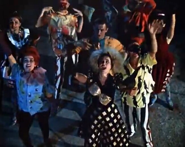 В детских фильмах, созданных в советскую эпоху, часто попадаются моменты, понятные и – смешные взрослому человеку. Например, в киносказке «Огонь, вода и медные трубы» (1967) герой читает Морскому Царю книжку о приключениях майора Пронина, в «Приключениях Буратино» (1975) поются довольно серьёзные тексты Булата Окуджавы, а в «Новогодних приключениях Маши Вити» (1975) пародируются вокально-инструментальные ансамбли. Вообще, насмешка над модой и юношескими вкусами «западного толка» проникали даже в сказочную реальность. Например, в экранизации повести Виталия Губарева «Королевство кривых зеркал» (1963) есть один фрагмент, который был хорошо понятен в эру Оттепели. Толпа ярко и безвкусно одетой молодёжи сначала танцует истерический, дикий танец, в котором угадываются ритмы буги-вуги, а потом просит пустить их на королевский бал. «Мы – танцоры короля!» - кричит стадо. Вид их в целом выпадает из эстетического ряда «Королевства…» (всех этих париков и фижм), равно как диссонирует и звукоряд.