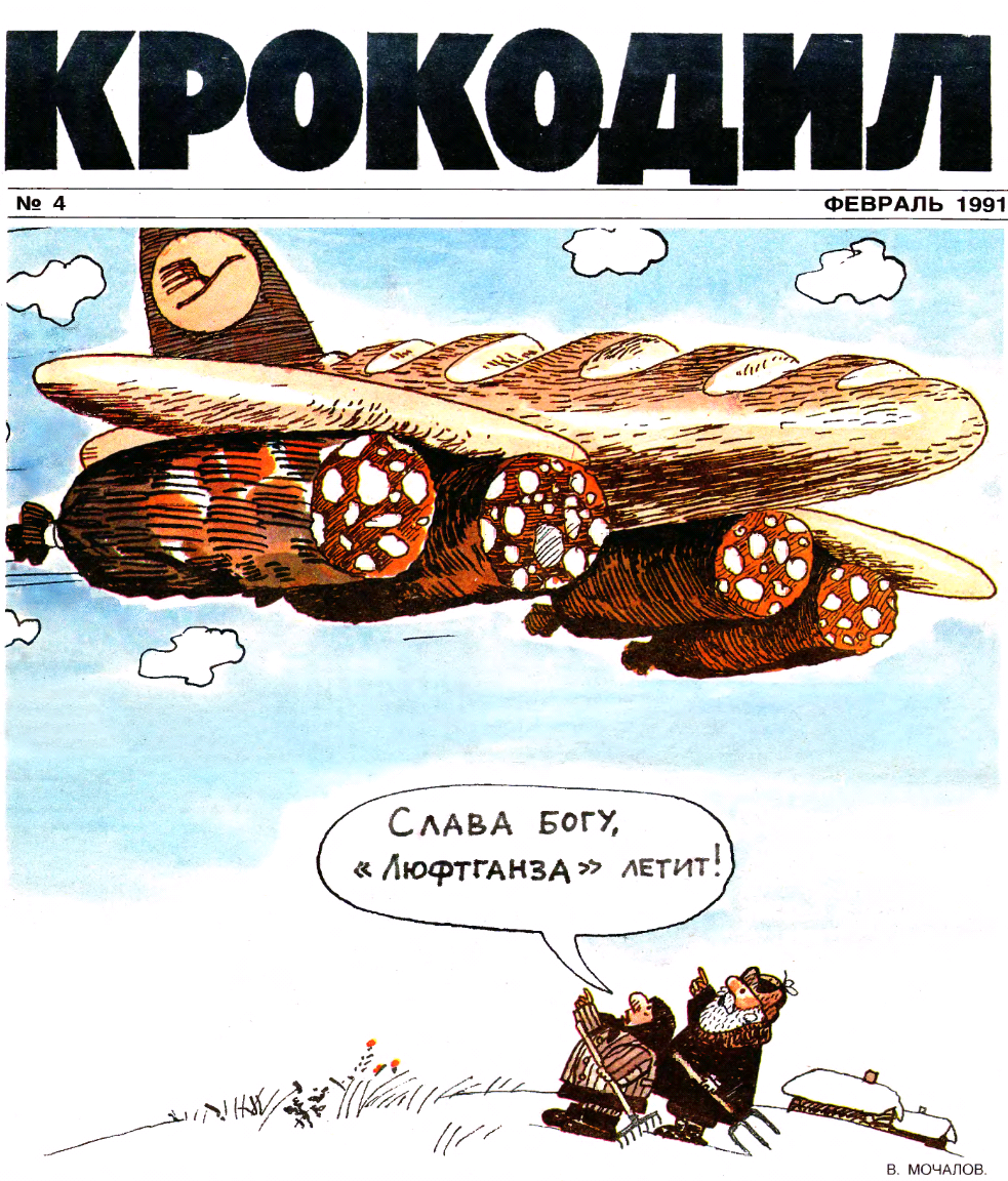 Всех приветствую! Мы наконец-таки добрались с вами до февральского выпуска журнала "Крокодил". Напомню, это времена когда Советский Союз подходил к своему завершению. Как это встречали тогда, мы частенько обсуждали, и в принципе, это настроение хорошо отражено в рисунках. Предлагаю посмотреть, а обсудить уже после публикации В девяностые годы, самобичевание и ненависть ко всему прошлому, перешли всякие границы. Не стоит обвинять в этом художников, потому что они лишь изобразили настроения народа. Я был тогда двенадцатилетним подростком, и прекрасно помню как в школе, и на улице, и дома - все ругали советское прошлое. Все ругали перестройку, и ждали от свободного будущего богатство и процветание, как там, за бугром. Как в заключительной карикатуре "Алиса в Зазеркалье". Я предполагаю, что автор, зарисовал заграницу, где достаток и сытость, а вторая, типо, бедность в наших магазинах - "наша" Советская действительность... ОбЫдно, да... И в тоже время, современная интерпретация сказки про