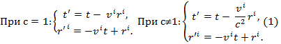 Несколько слов о фундаментальной скорости c. Уравнения (1) не накладывают на скорость ИСО каких либо ограничений. Но обратное к ней уравнение (2) противоречит ей: при превышении этой скорости координаты времени и пространства изменяют свои знаки. Т.к. эти два случая суть одно и то же, взаимно дополняя друг друга, то можно подумать и об ограничении скорости этой фундаментальной скоростью Тем более, при переходе через нее уравнение преобразования координат проходит через "сингулярность".