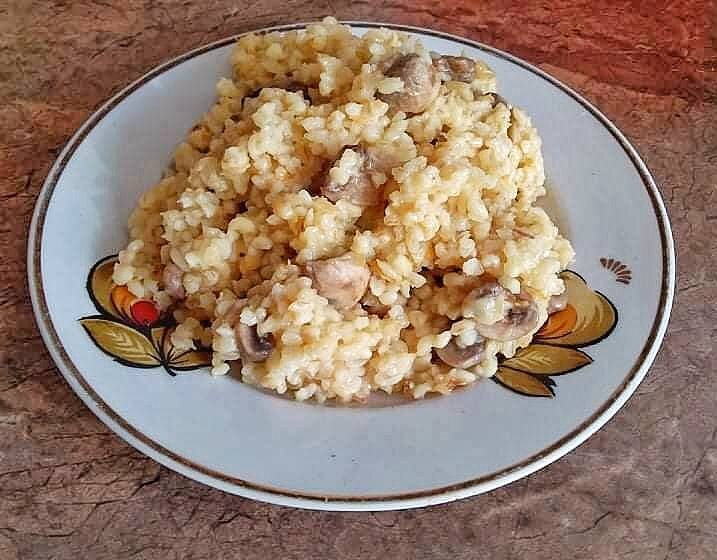 Ингредиенты: свинини або курячого філе, Свіжих шампіньйонів, морквина, цибулина, рису, Олія, Сіль та перець за смаком