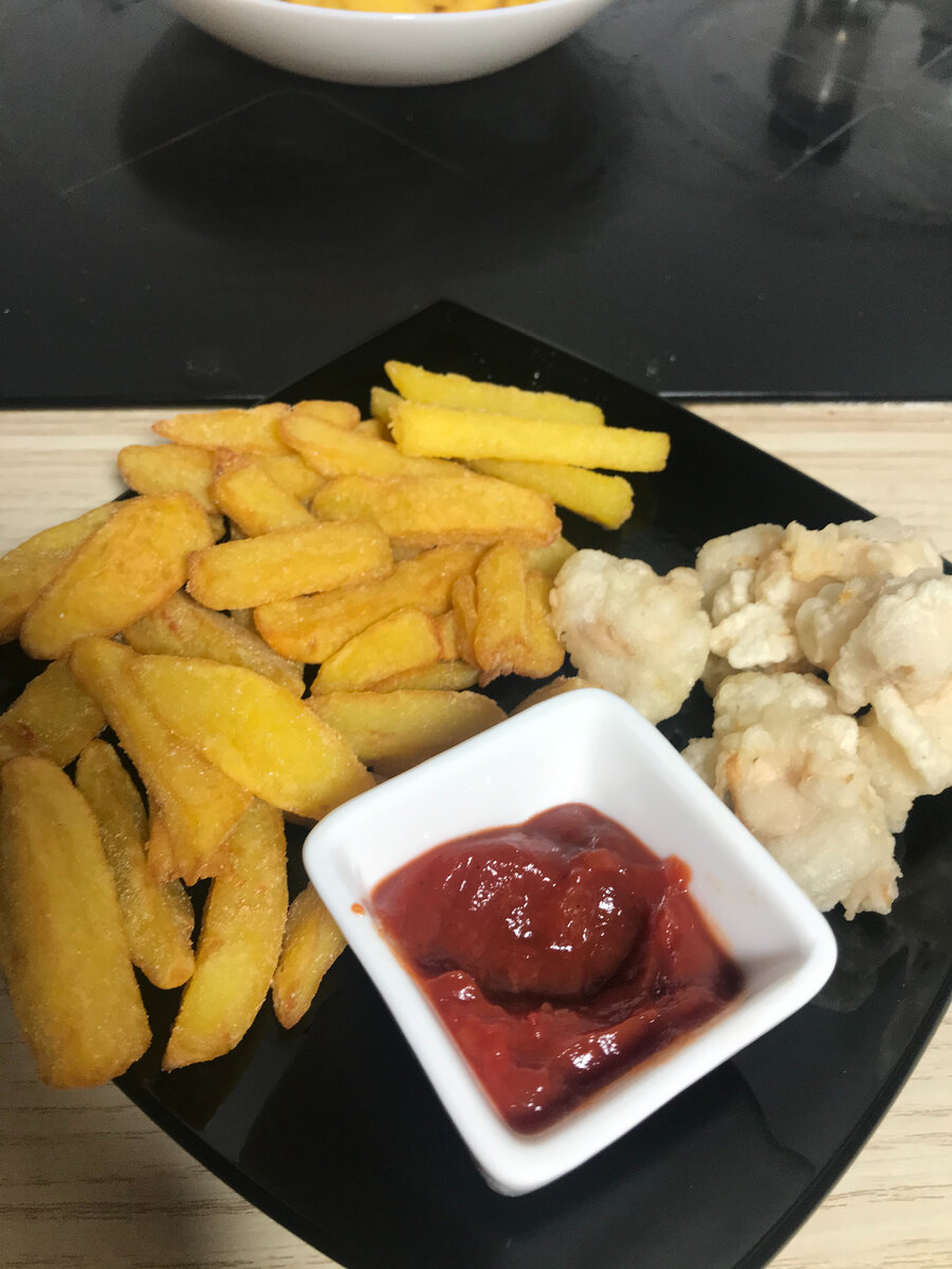 Наша самая любимая и знакомая всем с детства картошка фри! Ее захочется съесть сразу же несколько порций. Я расскажу как ее правильно приготовить. Хрустящую снаружи, мягкую внутри. Ингредиенты: Итак, начнем: Картофель, предварительно очищенный от кожуры, нарезаем ломтиками, примерно 1 см в ширину. В кастрюлю налить воду, добавить 2 ч ложки соли, 2 ст ложки сахара. Добавить картофель. Варить 5-7 мин. Всю воду слить, остудить. Обвалять в кукурузном крахмале ( именно с кукурузным крахмалом или кукурузной мукой картофель при жарке станет хрустящим). Можно использовать для панировки обычную пшеничную муку. Масло во фритюре или на сковороде хорошо прогреть, и опустить туда картофель. Жарить 5-7 минут. У нас получилось очень вкусное блюдо для всей семьи. Особенно в восторге будут дети! Есть так-же еще один способ приготовления картошки фри, более простой: сырой картофель нарезается ломтиками, и убирается в морозильную камеру на 1-1,5 часа. Затем замороженный сырой картофель обжаривается во