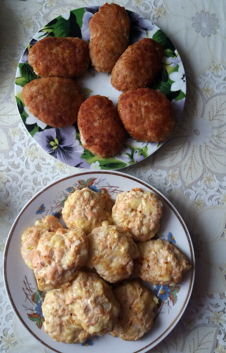 Сначала - котлеты из куриной грудки. Я думаю, что такие котлеты или бифштексы делали многие. Раньше делала из свинины, теперь - из куриной грудки. Куриную грудку нарезать мелким кубиком (у меня целая грудка). Лук репчатый (у меня - 4 - 5 штук размером с куриное яйцо) нарезать тоже мелким кубиком. Чуточку посолить, поперчить, добавить чеснок, нарезанный мелким кубиком твёрдый сыр (граммов 70-100), яичный белок от 3-4 яиц, 40 г измельчённых на блендере отрубей. Можно добавить тертый кабачок (его я добавляю летом). Хорошо всё вымешать и сформировать котлеты. На тефлоновый коврик (можно просто на противень, или на пергамент), размещаю котлеты и отправляю в духовку на 30 минут. Температура - 180 градусов. А в это время делаю котлеты для мужа, жареные обычным способом, из свинины. Всем известные наши котлеты, которые каждая хозяйка делает по своему. Главное - хорошо вымешать фарш и отбить с любовью 🙂. В духовке шкварятся, на печке жарятся... И всё готово. + 3 фото Больше общения и р