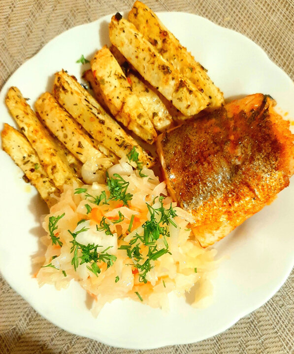 Сегодня на ужин - корень сельдерея с филе хека и квашеной капустой. Так как я стараюсь не жарить, и рыбу, и сельдерей запекала в духовке под верхним нагревом. Сельдерей припекла до состояния аль-денте, то есть он остался чуть-чуть хрустящим. Сахар "до" 4,7, через 2 часа 6,3. Больше общения и рецептов - в группе "Жизнь с диабетом" в Facebook! Рецепт на странице в Facebook Автор рецепта - Марина Воронська