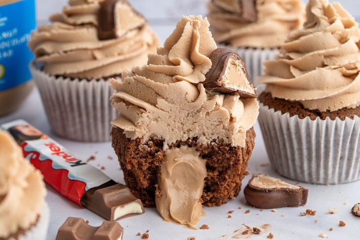 Вырезаем серединку у кекса 👉🏼 наполняем начинкой 👉🏼 украшаем кремом 👉🏼 добавляем Kinder Bueno 👉🏼 посыпаем из