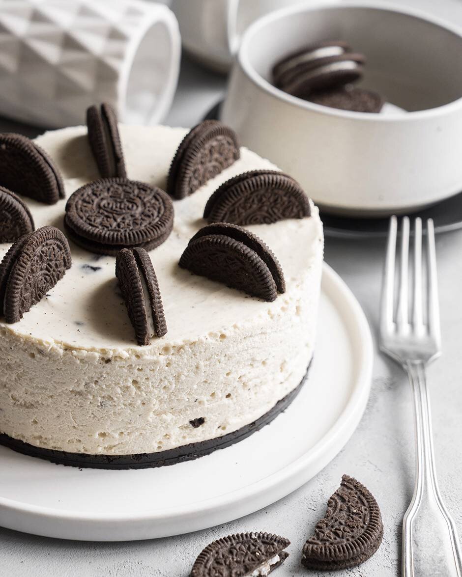 У печенья отделяем начинку и измельчаем его в блендере до состояния крошки. Добавляем растопленное сливочное масло и перемешиваем. 1/3 крошки оставляем для украшения, а всю остальную выкладываем в разъёмную форму и хорошо утрамбовываем (формируя дно вместе с бортиками). Убираем в холодильник пока будем готовить начинку.