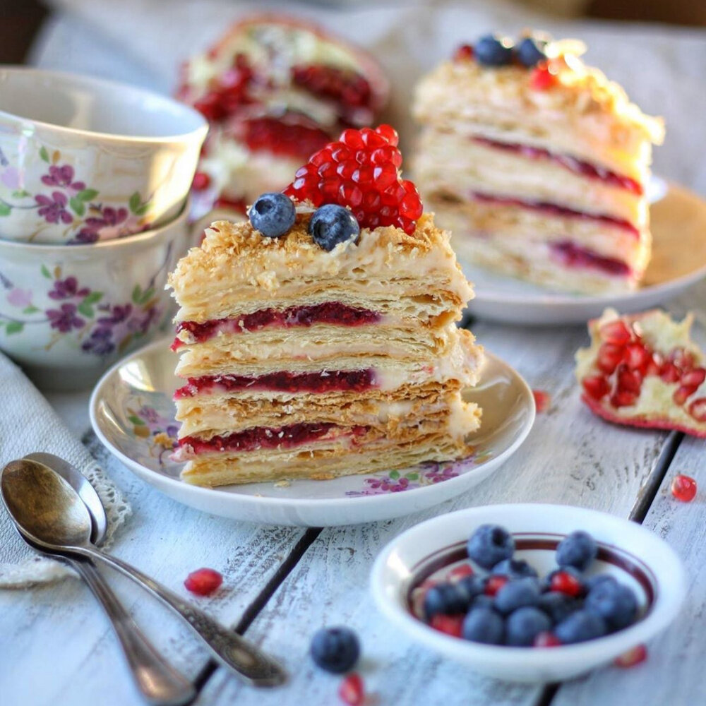 Размораживаем и раскатываем слоёное тесто. Вырезаем 4 круга диаметром 20 см и накалываем вилкой. Выпекаем вместе с обрезками в разогретой до 180 градусов духовке 10-15 минут. После остывания каждый корж делим на 2 части, а обрезки измельчаем в блендере.