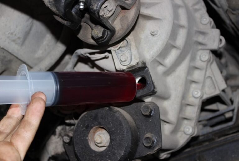 Вставляем в отверстие для заливки масла воронку и тонкий шланг или используем шприц и заливаем необходимое количество смазки в механическую коробку передач.