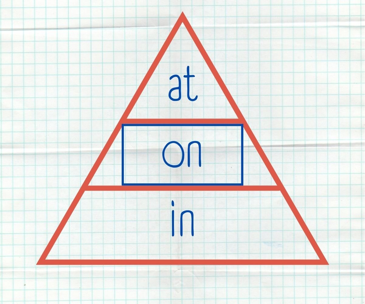 В одной из моих популярных статей я рассказывал про метод "Треугольника", который позволяет запомнить как правильно употреблять предлоги ВРЕМЕНИ английского языка. В этой статье я расскажу как использовать этот уникальный метод для предлогов МЕСТА. Наиболее популярными предлогами для обозначения мест в английском, являются предлоги "at", "on" и "in". Метод "Треугольника" помогает понять когда использовать тот или иной предлог, ведь площадь, которую занимает каждый из предлогов в фигуре треугольника, наглядно показывает с каким МЕСТОМ нам следует его использовать. Чем больше площадь - тем больше размер места (здания, сооружения) с которым этот предлог используется. AT - очень классный предлог, потому что он любит точность. Он находится в самой верхушке "Треугольника" и соответственно его следует использовать с точным местом или точкой на карте. Предлог AT следует использовать с Также предлог at используется с различными учреждениями, которые не показывают что это за здание, а являются