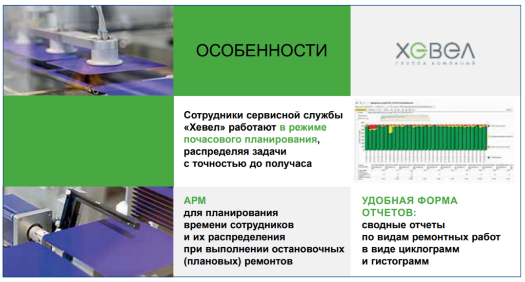 «Хевел» — крупнейшая российская компания в области солнечной энергетики. Мы создаем солнечные модули, у нас полный цикл производства солнечных электростанций. Наши станции введены в эксплуатацию в 7 регионах России и в Казахстане, они могут обеспечить электричеством более 180 тысяч частных домохозяйств или почти 1 млн городских жителей. Модули работают при влажности воздуха до 85% и температуре от -60 до +85 С, сохраняют не менее 80% мощности в течение 25 лет эксплуатации. Немаловажно, что наши станции дают энергию в тех регионах, где электроэнергия стоит особенно дорого. В группе компаний «Хевел» три подразделения: Наше производство на заводе в Чувашии практически полностью автоматизировано, это конвейерная система, которая работает с минимальным участием людей. Поэтому внеплановый ремонт на технологической линии — это сбои по всему циклу, прямые потери объемов готовой продукции и нарушение сроков ее выпуска. Завод работает 24/7, любой простой нам обходится в несколько сотен тысяч руб