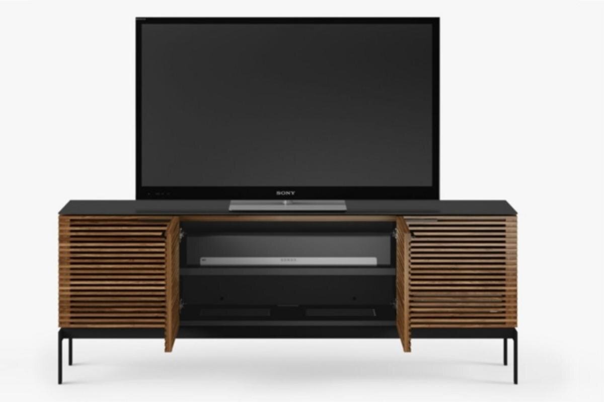 Тумбы BDI серии Corridor SV компактны и функциональны: глубина корпуса – минимальна (всего 40 см); дверцы с деревянными ламелями отлично пропускают звук и не мешают управлять с пульта спрятанными за ними электронными устройствами. Ширина тумбы BDI Corridor SV 7128 – 128 см. В днище тумбы имеются вентиляционные отверстия, в задней стенке вырезаны каналы для кабелей. Модель SV 7129 шире – 201 см – поскольку снабжена ещё двумя отсеками (также с дверцами). Её можно использовать как консоль для установки небольших компонентов домашнего кинотеатра; место найдётся и для игровой приставки, и для солидной коллекции дисков. Обе модели сделаны из массива дерева, варианты отделки: натуральный орех, шоколадный орех, морёный дуб. Верхняя плоскость дополнена панелью из закалённого стекла. Основание – из металла. #AV мебель #Домашний Кинотеатр