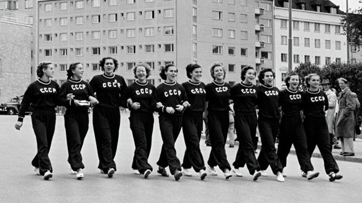 Первые Олимпиады советская форма имела предельно лаконичный вид. Надпись СССР на скромных тренировочных костюмах, которые вполне могли продаваться в обычном универмаге в пределах 100-150 сталинских рублей. Олимпийская мода СССР за 40 лет 1. Олимпиада - 1952 в Хельсинки, Сборная СССР В 1952 году наши олимпийцы были одеты достаточно скромно. 2. Олимпиада - 1956 в Кортина-д’Ампеццо, Сборная СССР Об одежде нашей сборной в 1956 году шептался весь мир. Дело в том, что 55 советских спортсменов вышли в строгих пальто традиционного американского цвета (темно-синий). Правда, остальные предметы парадной формы — красные шарфы, пыжиковые шапки и черные брюки со стрелками — были вполне идеологически выдержанными.