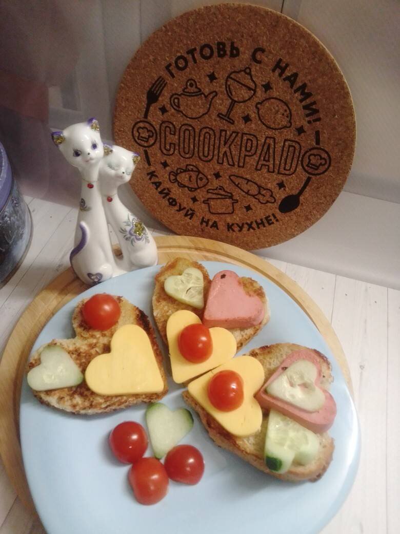 С Днём Святого Валентина! Конечно,в этот день хочется всех любимых радовать,удивлять. И чтоб даже на завтрак были валентинки-бутерброды в форме сердца,символа сегодняшнего дня. #валентинки #игры Ингредиенты: Пшеничного хлеба, Твердого сыра, Масло сливочное, Вареной колбасы, Свежий огурец, Помидоры черри, Формы для печенья в виде сердец разного размера Способ приготовления: Берём кусочки хлеба и самой большой формой выдавливаем в них сердца. Обжариваем на сливочном масле с двух сторон. Отрезаем кусочки сыра и выдавливаем в них сердечки меньшей формы. Выкладываем на тосты. Затем, по такому же принципу, делаем сердца из вареной колбасы. Немного обжариваем на сковороде с двух сторон и тоже выкладываем на тосты. Более мелкие сердца выдавала из огурца. Ну и немного яркости добавляем помидорами черри. Приятного аппетита 😋.