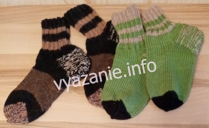 И снова мужские носки. Зелёные по дому ходить, тёмные — в сапоги. Наш мужчина 5 пар носков за зиму снашивает. Вот мы и стараемся, вяжем. Тёплые, удобные, весёленькие. Связаны одинаково. Тёмная пряжа — шерсть 100%, зелёная - с акрилом. В 100 г 180 м. Ещё в пятку ввязана носочная добавка. Потому, что у нашего мужчины пятка — это «слабое звено». Спицы №3 носочные 2 комплекта. Объясню, почему я использую сразу 2 комплекта спиц. Когда вяжешь полосатые носки, особенно, если из остатков пряжи, трудно связать совершенно одинаковую пару. То нитка не вовремя закончится, то ряд лишний связался в полоске. Поэтому вяжу на одних спицах до нового цвета и перехожу ко второму носку, вяжу до этого же места. Потом меняю цвет и снова вяжу до определённого места, например, до пятки. Вяжу 2 пятки. И так до конца: то один носок вяжу, то второй. Если забыла, какой вязала, беру тот, который короче. Носки мужские. Размер носков 43. Набираю на 2 сложенные вместе спицы, 48 петель +1 для смыкания в круг. Распреде