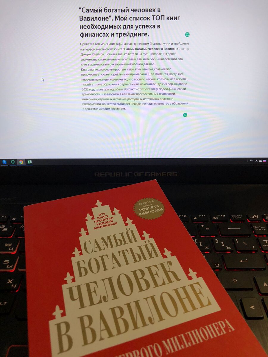 Привет! в топ моих книг о финансах, денежном благополучии и трейдинге на первом месте стоит книга "Самый богатый человек в Вавилоне", автор Джорж Клейсон. Если вы только встали на путь накопления денег, знакомства с накоплением капитала и вам интересны инвестиции, эта книга должна стать букварём или библией для вас.