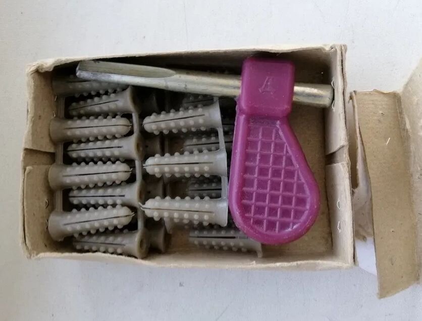 Представьте себе типичную историю – в стене надо пробурить несколько отверстий, чтобы повесить шкафчик, или картину, часы, или стул в конце концов, если вы сторонник смелых решений в стиле авангарда. Представили? Кажется, что может быть проще. Взял перфоратор, подходящий бур, пробурил, установил дюбель и повесил стул. Ну, то есть, шкафчик. А теперь представьте, что перфоратора нет. Пфф, тоже мне сложность – скажут сейчас некоторые. Мастер на час всегда поможет, достаточно сделать пару нажатий на экране телефона и дальше будут работать специально обученные «иностранные специалисты». А теперь представьте, что нет ни перфоратора, ни телефона, а иностранные специалисты пока еще трудятся у себя дома в своих солнечных республиках, и на дворе так, середина восьмидесятых. Вот тут уже интересней. Выбор стенопродалбывательных инструментов был весьма ограничен, но как правило, в каждой квартире была вот такая штука. Пробойник с небольшой ручкой и несколько дюбелей сделанных из полиэтилена. Вмест
