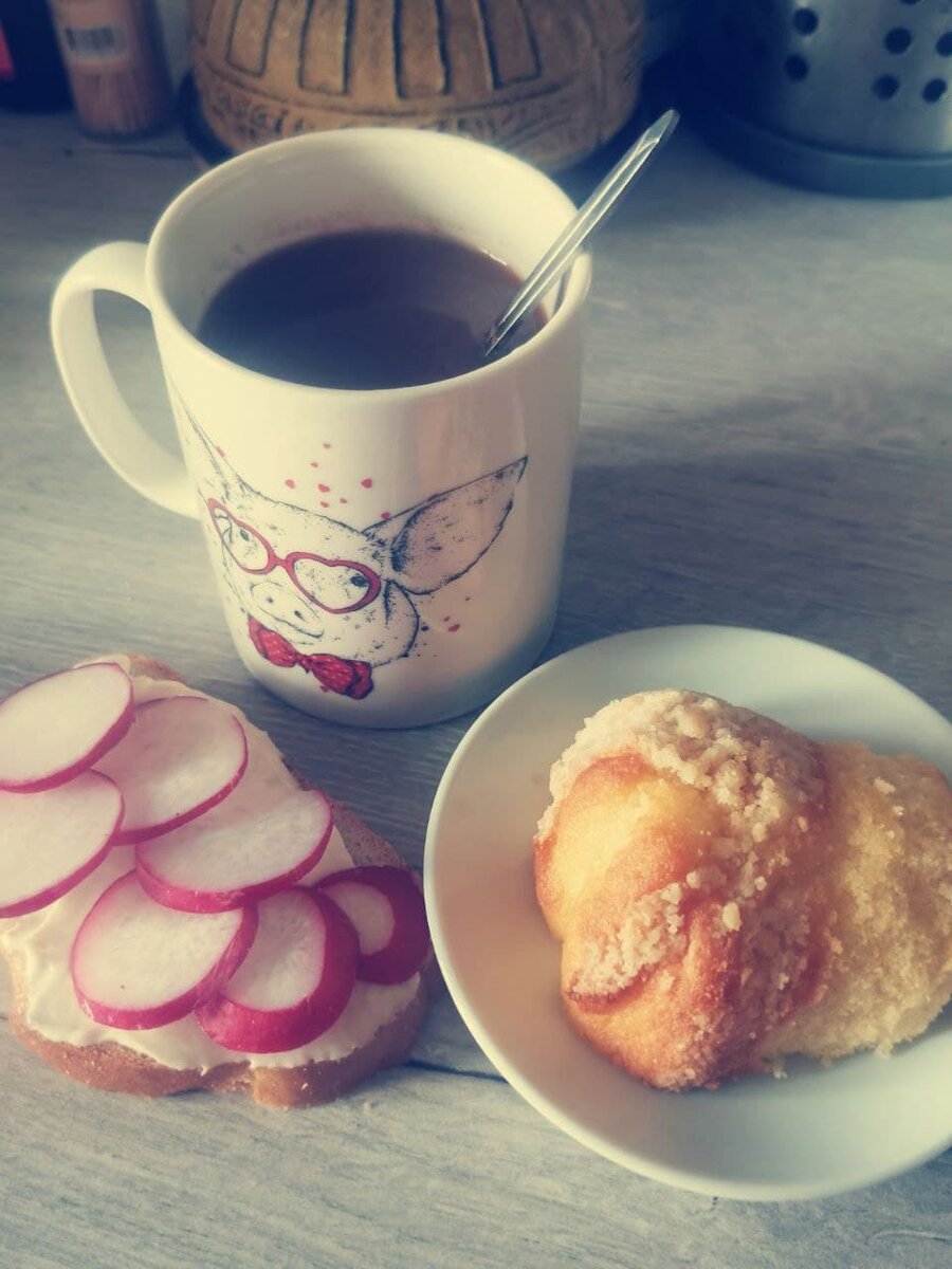 Завтрак Бутерброд с плавленым сыром и внезапно! Редиской) Вкусно. Кусок кекса и кофе со сгущенкой. Кофе со сгущенкой меня научила бабушка, она только так и пила его на даче. Бабушки больше нет, а моя привычка осталась, вкусно превкусное для меня. Чашку мне подарила сестра, сказала, что персонаж на меня похож. Но после подарка понятно же кто из нас свинья)) Обед Щи из квашеной капусты Хлеб с маслом Боженьки, спасибо, что есть такой суп. Вкусно, легко, недорого. Потом съела кусок хлеба с салом. Ужин Солянка с колбасой. Использовала жопки и 1 сосиску. Капуста, лук, морковь, колбаса, 1 сосиска, балык. Вместо томатной пасты влила томатный сок. Ну и специи, те которые люблю: чеснок, тимьян, лаврушка. ОГОНЬ! Кажется, что одна капуста, но так совпало. Я уже тыщу лет хотела солянку) Закупки Решила в обед прогуляться и не прошла мимо яблок. И хлеб надо, булочки булочками, а щи без черного хлеба не съешь. Вспомнила про весы. Могу теперь считать и КБЖУ, если кому-то интересно. Пишите! Итого: