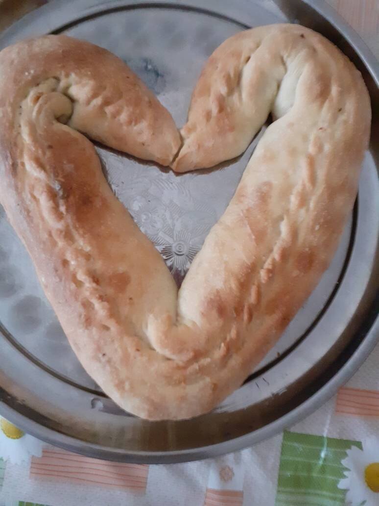 Решила попробовать приготовить пирог с мясом, остался плов, тоже пошёл в ход, получилось вкусно. #валентинки Ингредиенты: дрожжевое тесто, Начинка, риса, или плов, мяса варёного, лук Способ приготовления: Мясо с луком обжариваем и остужаем. Тесто тонко раскатываем в длину, примерно пол сантиметра. Сначала кладём начинку из риса, сверху мясную, защиты края, кладём на противень в форме сердца. Даем постоять минут 20, ставим в духовку. Когда пирог будет готов, смазываем водой или маслом сливочным.