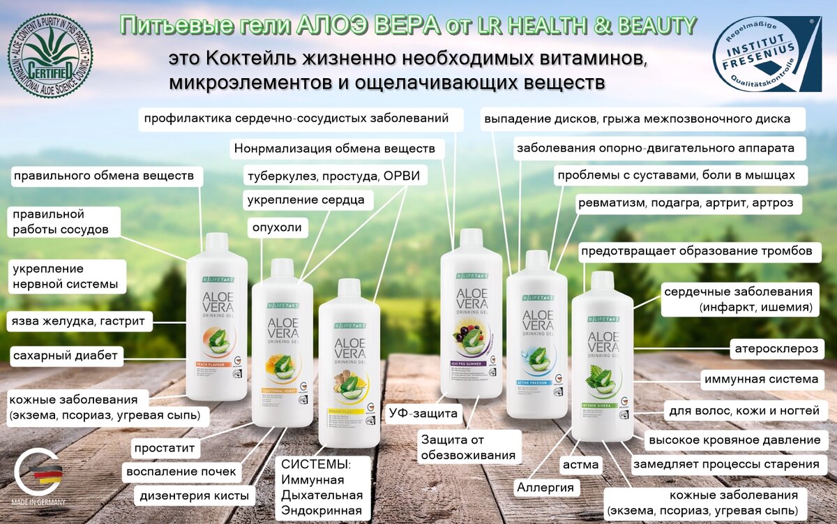 Все они без исключения — с высоким содержанием чистого листового геля Алоэ Вера (от 88% до 98%), содержащего более 200 полезных веществ. И имеют 6 вкусов. Независимо от выбранного геля — вы получаете обновление организма на клеточном уровне. Т.е не просто помощь и снятие симптомов, как в случае с лекарствами, а воздействие на саму причину заболевания. Не лечение органов и клеток, а их ОБНОВЛЕНИЕ 🌱 Каждый гель, не смотря на общую основу, обогащен дополнительными веществами, для лучшего результата в борьбе с тем или иным заболеванием.