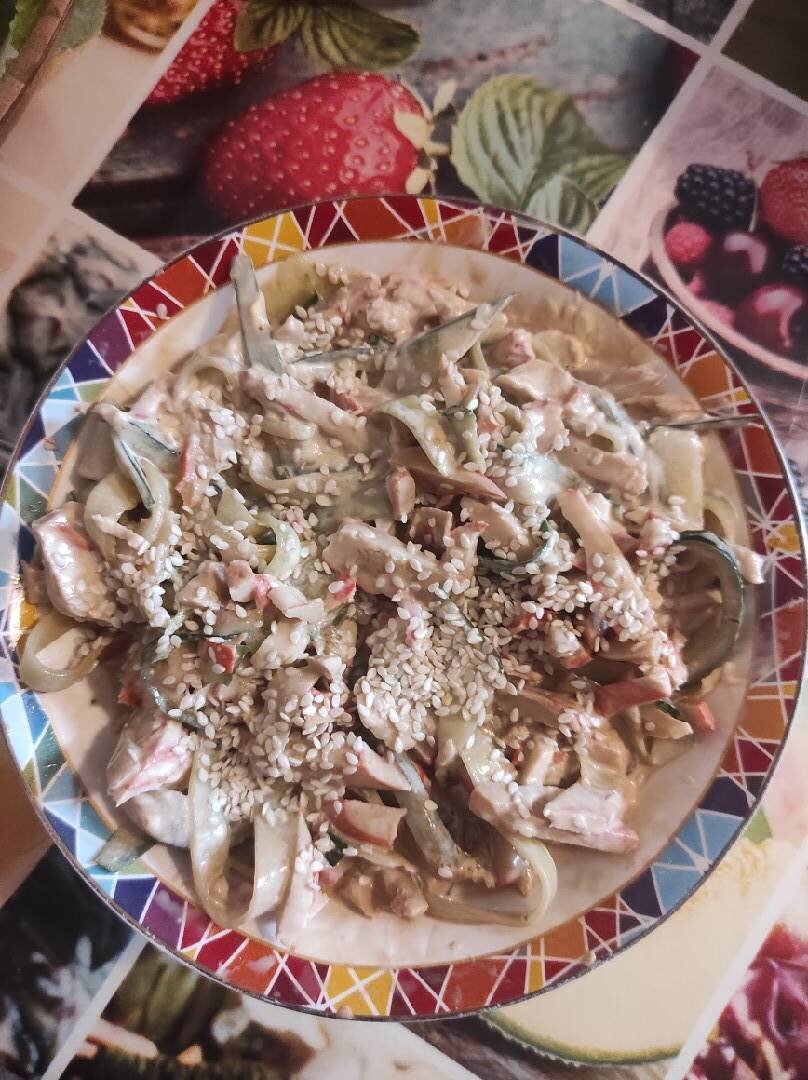Ингредиенты: Огурец, Крабовые палочки, Соевый соус, Лёгкий майонез, Кунжут Способ приготовления: Огурец нарезаем тонкой, длинной соломкой (я использовала чистилку для овощей). Крабовые палочки нарезаем также соломкой. Добавляем немного соевого соуса и майонеза. Аккуратно перемешиваем, сверху украшаем кунжутом. Приятного аппетита!