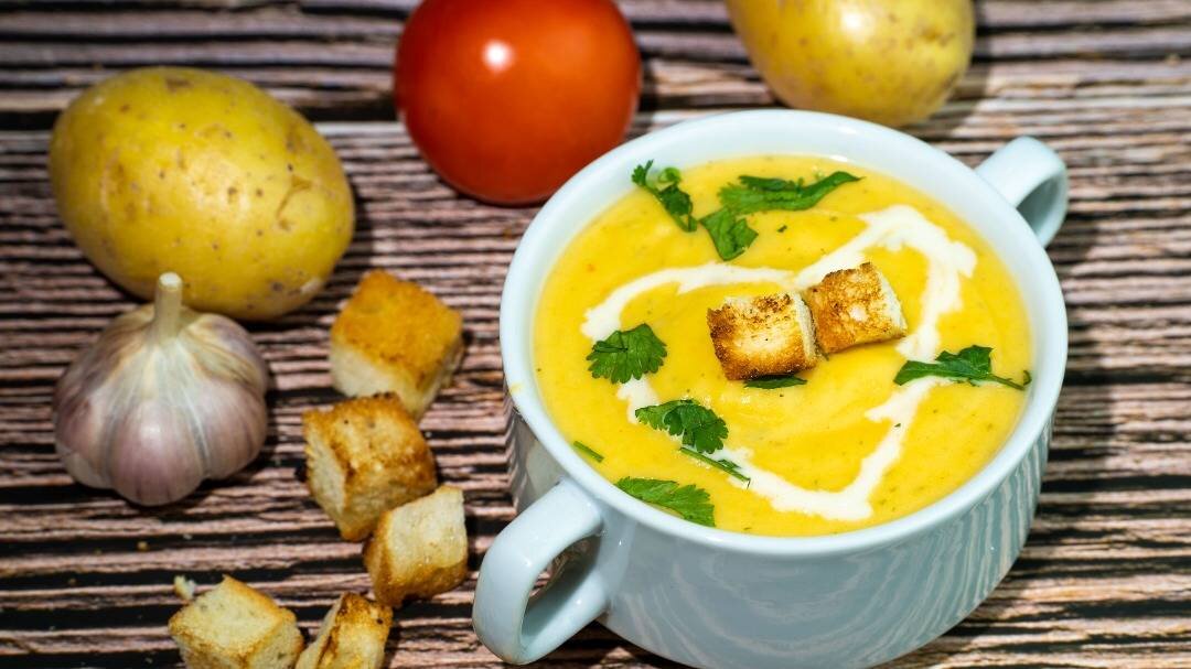 Идеальный рецепт приготовления овощного супа-пюре со сливками и хрустящими чесночными гренками, который приятно удивит своими великолепными вкусовыми качествами! #игры Ингредиенты: Картофель , Репчатый лук, Растительное масло , Морковь, Болгарский перец, Сельдерей, Вода, Сушеная зелень , Мускатный орех , Сливки, Батон (белый хлеб), Чеснок, Сливочное масло , Смесь перцев , Соль Способ приготовления: Выливаем в поставленную на плиту кастрюлю 2 столовых ложки растительного масла, затем выкладываем в нее 1 головку мелко нарезанного репчатого лука и обжариваем его на большом огне до прозрачности. Натираем на крупной терке 1 морковь, которую затем выкладываем в кастрюлю с луком и перемешивая обжариваем. Нарезаем крупными кусочками 700 граммов очищенного картофеля, затем выкладываем его в общую кастрюлю и перемешивая овощи между собой прогреваем картошку 5 минут. Мелко нарезаем 0,5 болгарского перца, 1 стебель сельдерея и выкладываем в общую кастрюлю, затем перемешиваем овощи между собой и пр