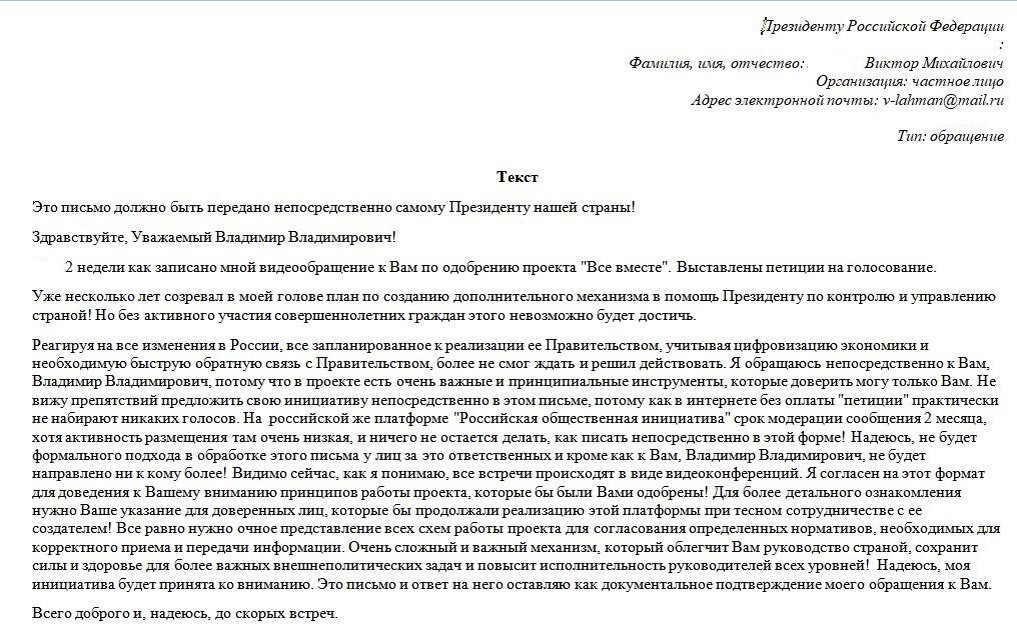 Хочу сегодня для вас выставить свои действия, которые производил до болезни. Первое что предпринял, как вы помните, начал с видеообращения к Президенту. Пришлось идти по неизбежному пути, что бы потом не сказали почему не обращался. Обратился, в приемную Президента. Да друзья, ну как без этого? Челобитную послал, а вот результат совсем такой не ожидал. Хотя до этого часто обращался именно с похожим результатом. Давно бы прекратить это все одним махом, создать уникальную платформу "Все вместе" и жить в покое, где уже никто никогда из чиновников не сможет отвернутся от своих обязанностей перед российским народом.. Бегаем упрашиваем, послушайте нас "ваших рабов". Мы зачем избирали тех, кто нас не слушает? Ну да ладно... Вы же не будете равнодушны к судьбе России и поможете мне стены пробивать? А так как мы"все вместе", дело сделаем. А о чем это я? Ах да... Вот пока вам писал, вспомнил, что ответ у меня от них уже есть. Вот он... Конечно, где-то в подсознании, мне очень хотелось