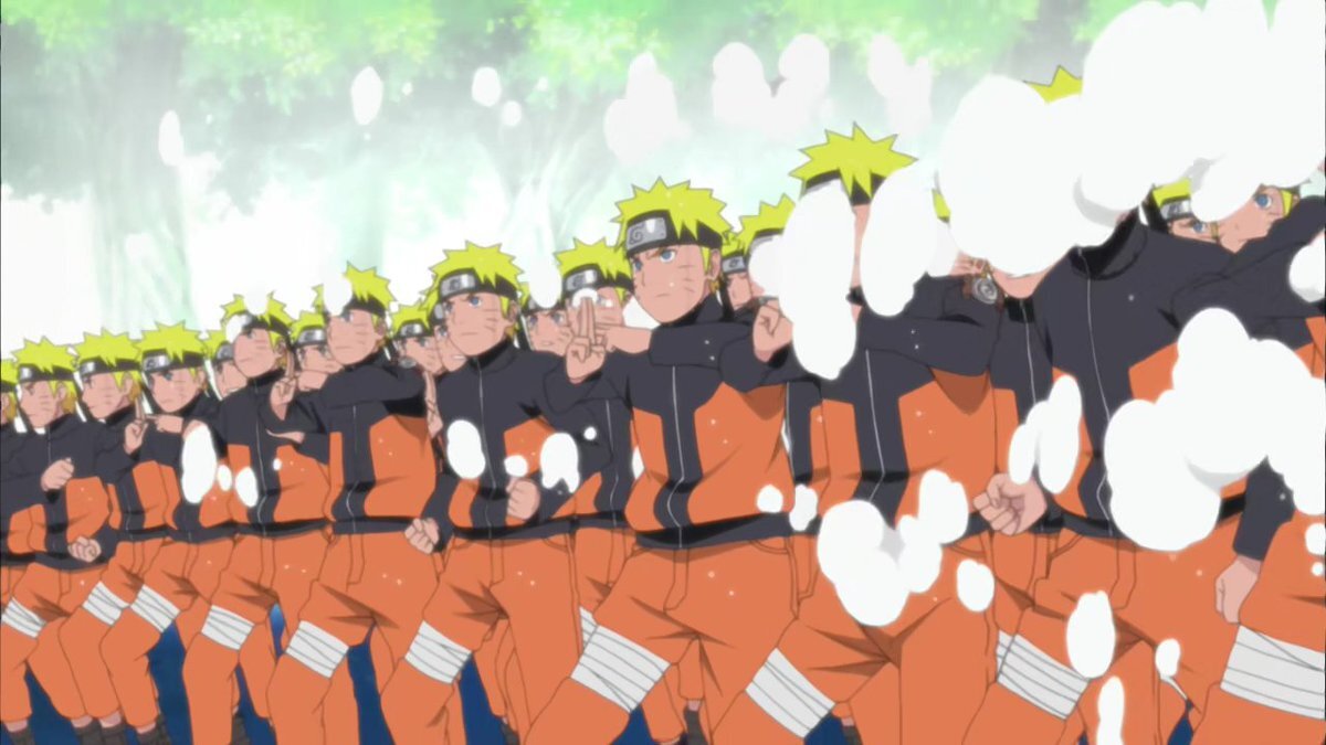 Одна из самых известных техник. Она позволяет использовавшему её создать несколько копий самого себя. При этом чакра шиноби делится между всеми клонами. Т.е. если создать 9 теневых клонов, то каждый из них получит по 10% чакры, включая самого шиноби. Так же существует техника множественного теневого клонирования. Эта техника позволяет одновременно создавать сотни теневых клонов, но и чакра делится между ними равномерно. Т.е., если создать 999 теневых клонов, то у каждого из них будет 0,1%, а следовательно и у использовавшего её тоже останется 0,1% чакры. Это опасно для шиноби, поэтому техника массового теневого клонирования получила статус запретной. В отличие от обычного клонирования, теневые клоны являются телесными, а не просто иллюзиями. Также копируется обычное оружие и одежда шиноби, воспользовавшегося этой техникой. Оружие вроде гунбая невозможно скопировать. Это видимо сделано, чтобы избежать дозбалланса. Клоны могут выполнять самые разные задачи и использовать все техники о