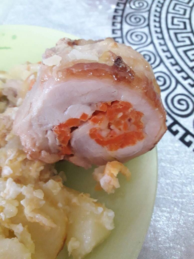 Всё гениальное - просто! Предлагаю приготовить нежнейшие рулетики из куриных окорочков. Получается намного дешевле, чем готовить из филе кур. Но придётся немного потрудиться над разделыванием окорочков))). Начинка может быть абсолютно любая - грибы, сыр, ананасы... Сегодня мы нафаршируем морковкой по-корейски Ингредиенты: куриных окорочка, морковки по-корейски, майонеза, Соль, Зелень Способ приготовления: Для начала необходимо вымыть окорочка, отделить мясо от костей одним пластом. Для этого нужно аккуратно ножом срезать мясо вдоль кости и у основания. Хрящики можно оставлять, они после приготовления становятся мягкими. Затем получившиеся филе нужно хорошо отбить молоточком. Смазываем немного майонезом, сверху на него 50 г морковки, это примерно 1 ст. ложка. Слегка посолить. В нашей семье мы с мужем очень уважаем кинзу)))). Добавили и ее. А теперь закручиваем наши рулетики, укладываем в форму для запекания, делаем сеточку из майонеза и отправляем всю эту красоту в духовку при температу