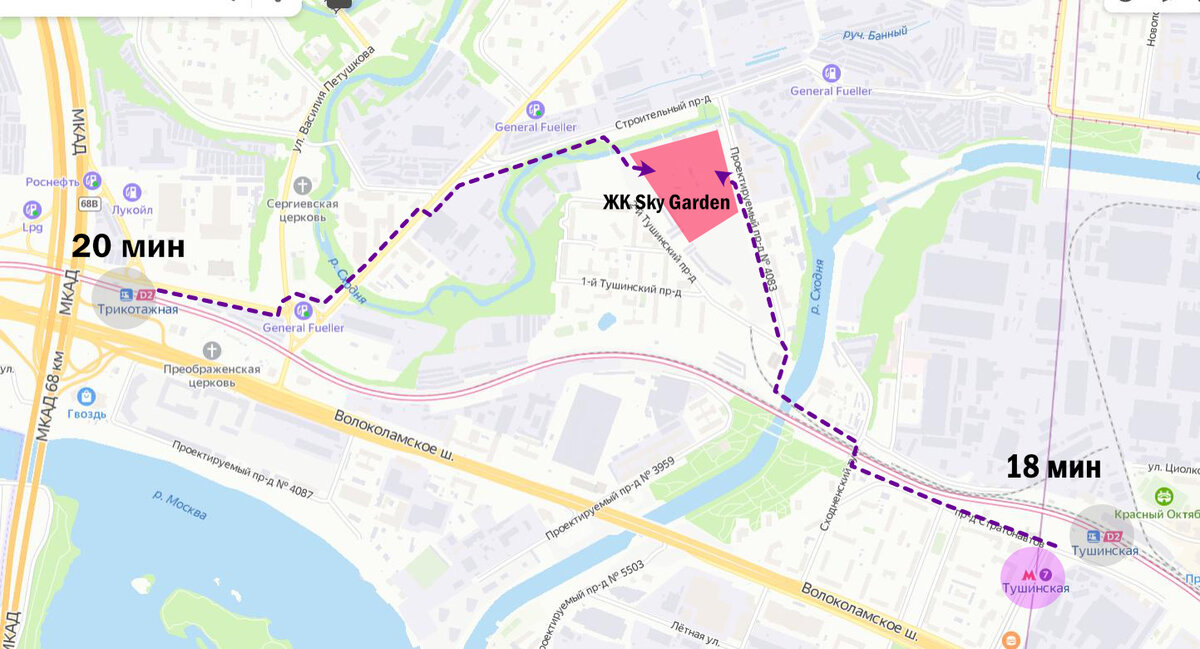 Возможно кто-то захочет добираться до ЖК Sky Garden (Скай Гарден) от станции МЦД2 Трикотажная — примерно 20 минут пешком