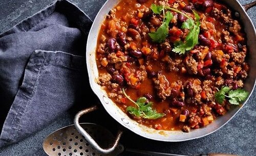 Добавляем к овощам фарш. Когда мясо готово, добавляем томатную пасту, мелко нарезанные помидоры. Заливаем все мясным бульоном или водой.