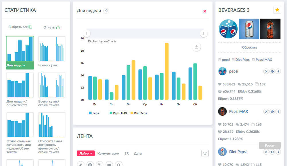 Ниже приведён список сервисов, с помощью которых вы сможете проанализировать свои посты, целевую аудиторию, изучить основных конкурентов, а также узнать про оптимизацию и вовлечённость аккаунта. Socialstats Анализ постов, лайков, репостов, активности подписчиков. Широкие настройки фильтрации результатов, вывод статистики. media-vk.ru Сервис для изучения конкурентов, поможет поставить портрет потребителя. Сервис платный, стоимость услуга зависит от количества участников группы, которую вы хотите проанализировать. Аналитика расскажет вам о лучшем взаимодействии и выдаст статистику групп на рынке. livedune.ru Сайт выдаёт подробную статистику. Также помогает в подборе лучших рекламных площадок. Основная фишка - поиск лидеров мнений. Любимый сайт блогеров. Popsters Аналитика контента в социальных сетях. Сравнение и анализ охвата публикаций. Поиск по ключевому слову во всех социальных сетях. Picalytics Сервис для глубокой аналитики аккаунтов Instagram. Собирает и анализирует информацию п