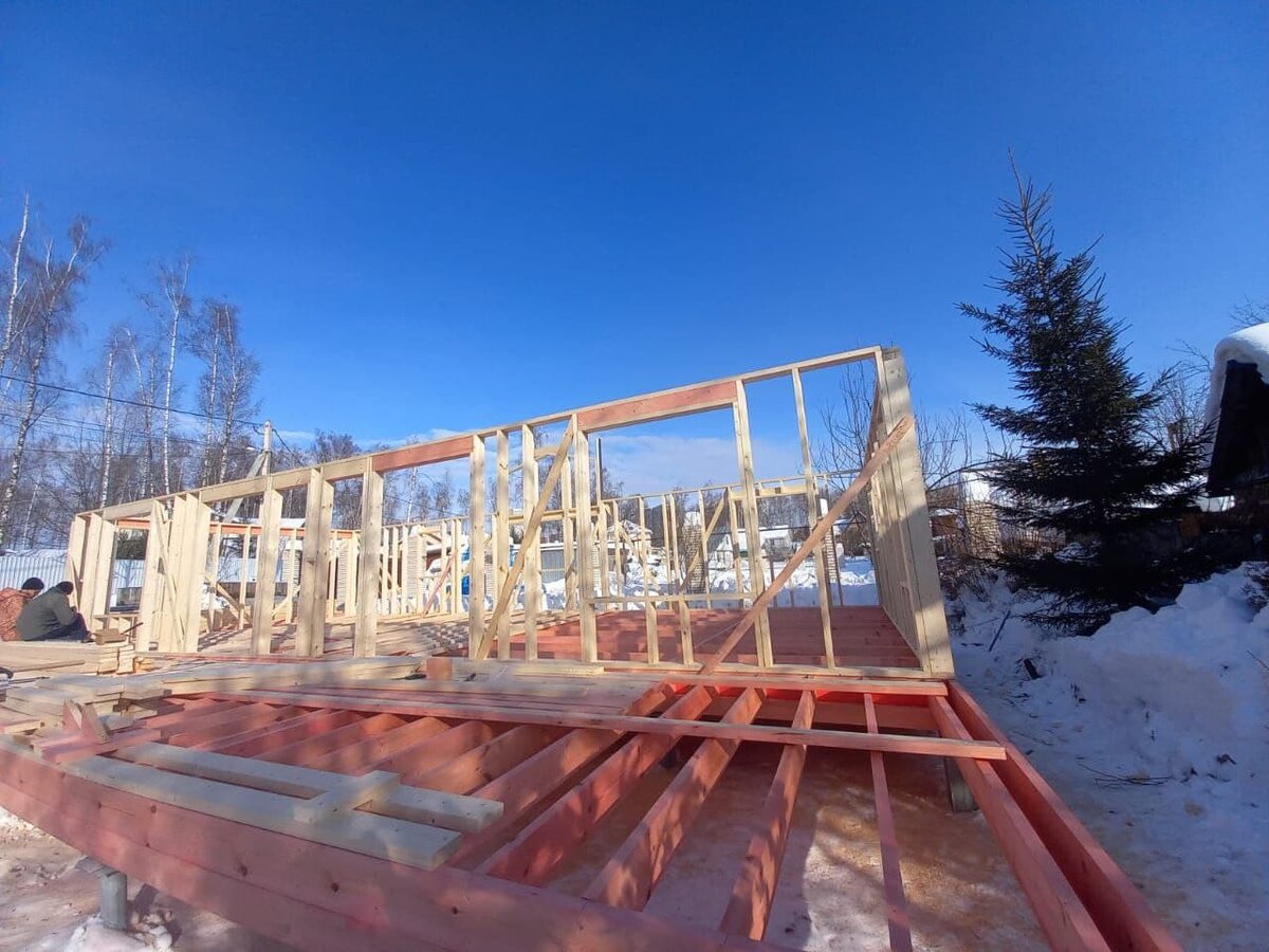 Наша бригада уже собрала каркас основных стен. Места для складирования материала не очень много, поэтому подвозят его под этапы работ. Там где доски соприкасаются друг с другом между ними добавляют прокладку для плотного прилегания. Таких мест не много, но они есть. Это поможет избежать щелей и продувания при той или иной деформации дерева. Убережет и от непредвиденных ошибок при стягивании. Выглядит очень правильно. Я сам участвовал в сборке каркасных пристроек у родителей на даче. Мы конечно (хоть и для себя) работали существенно грубее и без таких мелочей. Каркас растет на глазах. Уже можно "увидеть" пятно дома на участке. Нам кажется мы не ошиблись с его расположением. Он там, где нужно. Надо будет сходить еще раз с квадрокоптером. Вообще, на участке сейчас чувствуется какой-то уют (заезжали вечером в воскресенье всей семьей). Чистое рабочее место со снежком. Телевизор рабочие настроили (подняли тяпку повыше). Слышно как тихонько он бормочет в домике вечером. Лампа освещает крыль